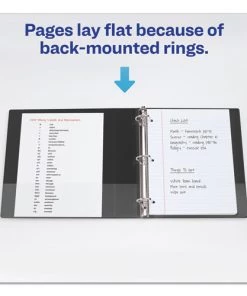 - Pages lie flat with back-mounted rings; exposed rivets on back