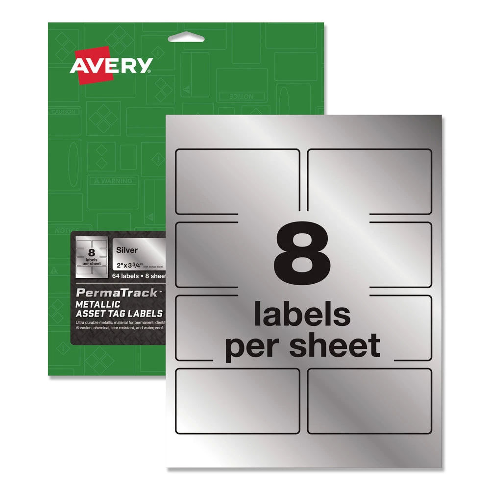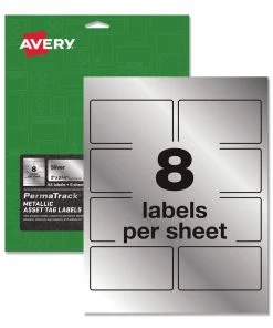 - 8/Sheet 8 Sheets/Pack 2 in. x 3.75 in. Laser Printers Metallic Asset Tag Labels – Silver – AVE61520