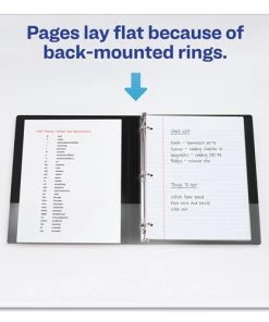 - Pages lie flat with back-mounted rings