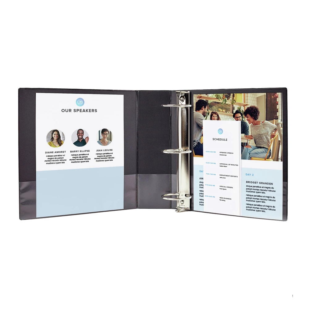 - Wide front and back binder panels fully cover standard dividers and sheet protectors