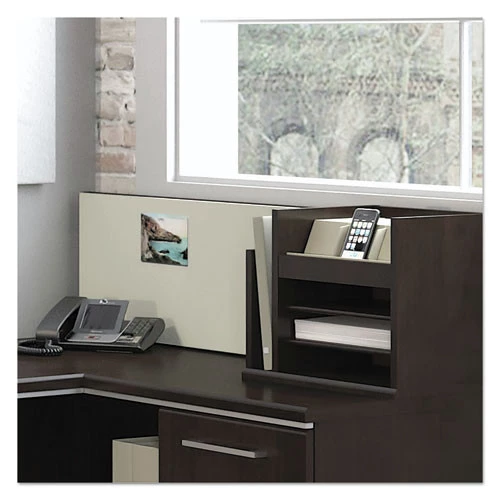 - Movable micro hutch/tack board (included) can be mounted on either side of Desk