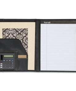 - Features writing pad, dual powered calculator, pen loop, inside storage pockets for documents and business cards