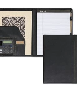 - Features writing pad, dual powered calculator, pen loop, inside storage pockets for documents and business cards